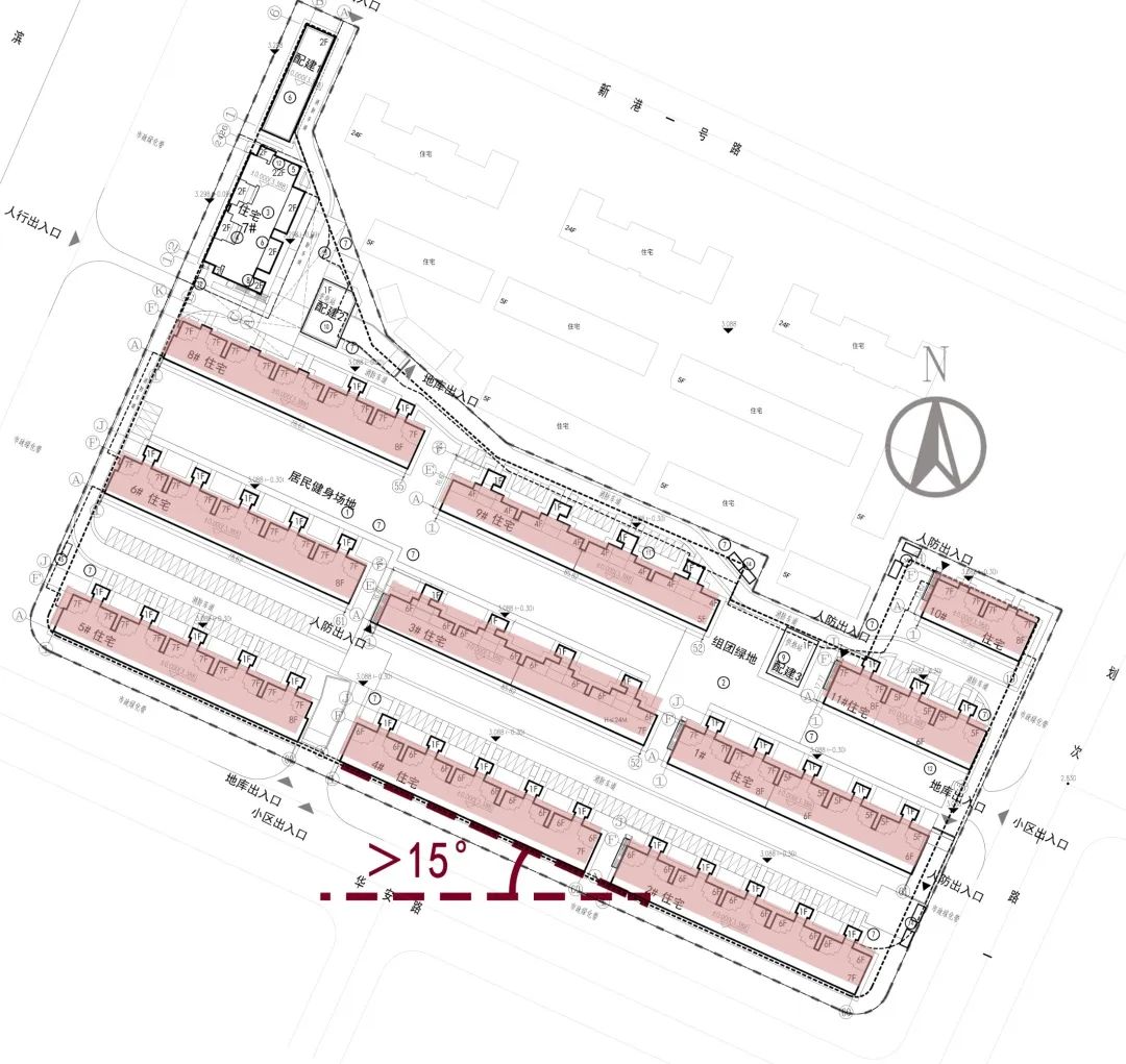 此項目洋房布置角度大于15°,根據(jù)天津市城市規(guī)劃管理規(guī)定要求,可以減小建筑間距,從而增大洋房密度及洋房比例,增加單平米銷售價格,但犧牲全天日照時長。