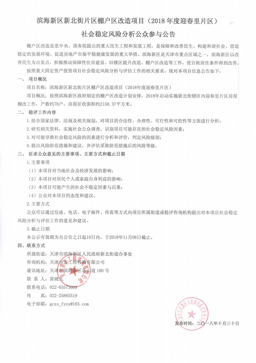 濱海新區(qū)新北街片區(qū)棚戶區(qū)改造項(xiàng)目(2018年度迎春里片區(qū))社會穩(wěn)定風(fēng)險分析公眾參與公告
