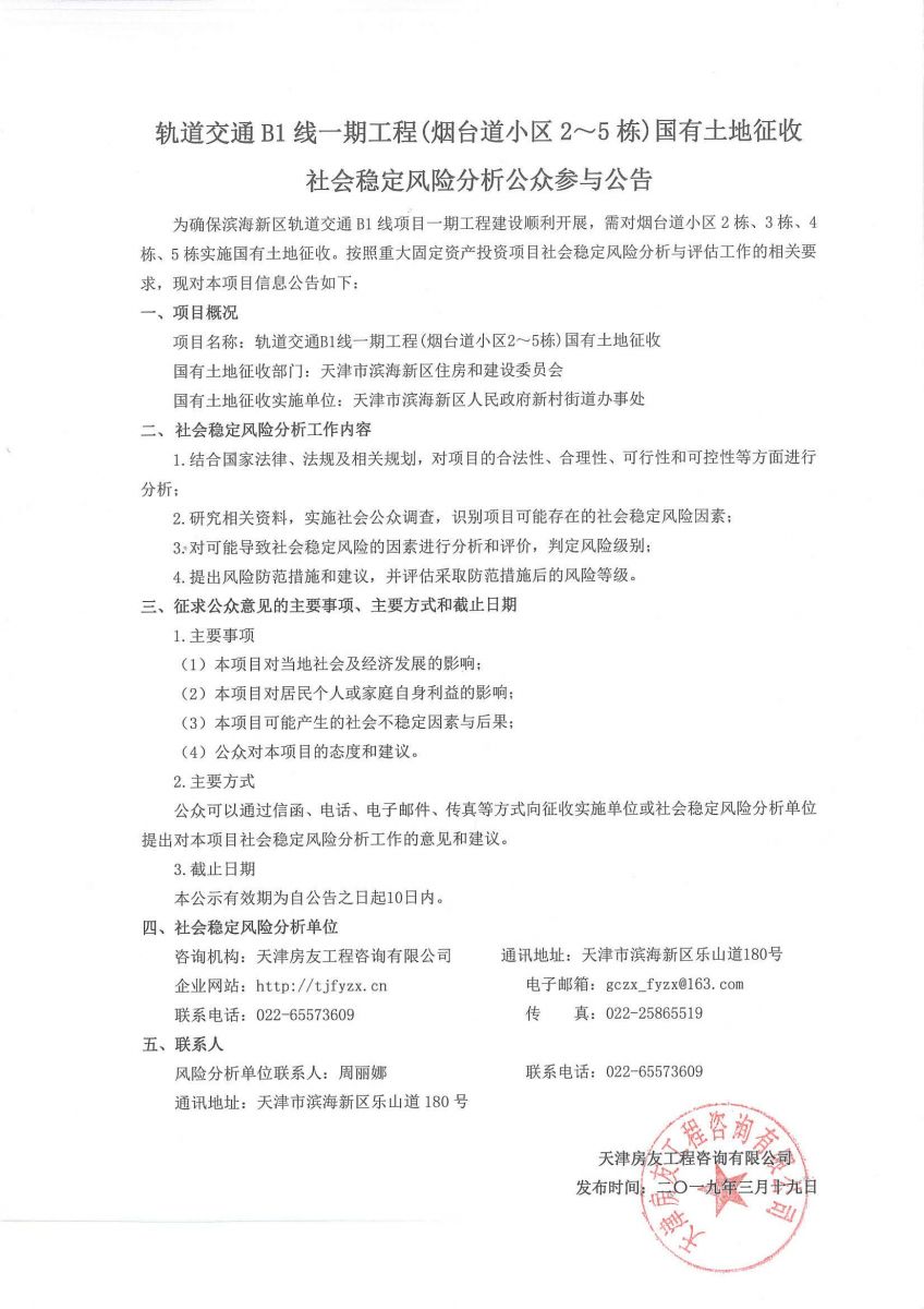 軌道交通B1線一期工程(煙臺道小區(qū)2~5棟)國有土地征收社會穩(wěn)定風(fēng)險分析公眾參與公告