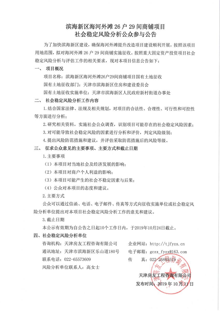 濱海新區(qū)海河外灘26戶29間商鋪項目社會穩(wěn)定風險分析公眾參與公告