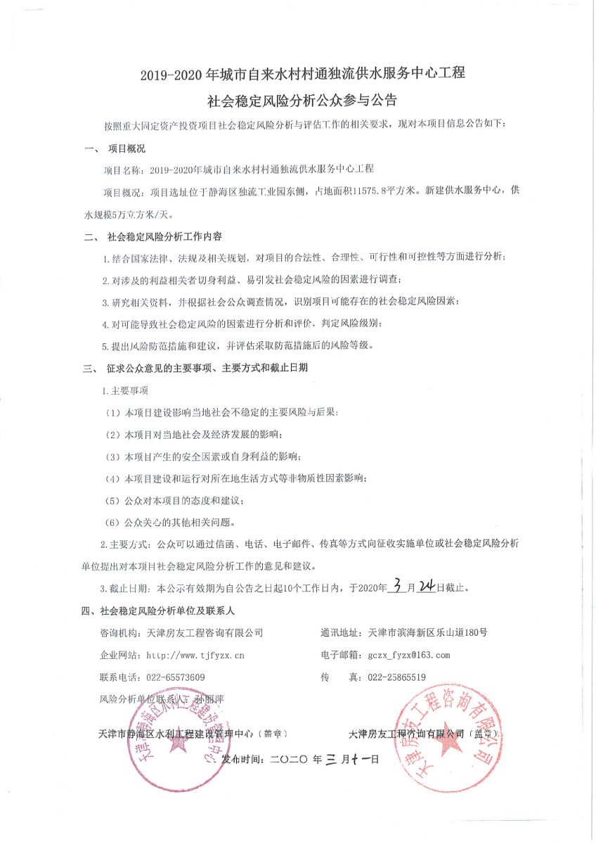 2019-2020年城市自來水村村通獨(dú)流供水服務(wù)中心工程社會穩(wěn)定風(fēng)險(xiǎn)分析公眾參與公告