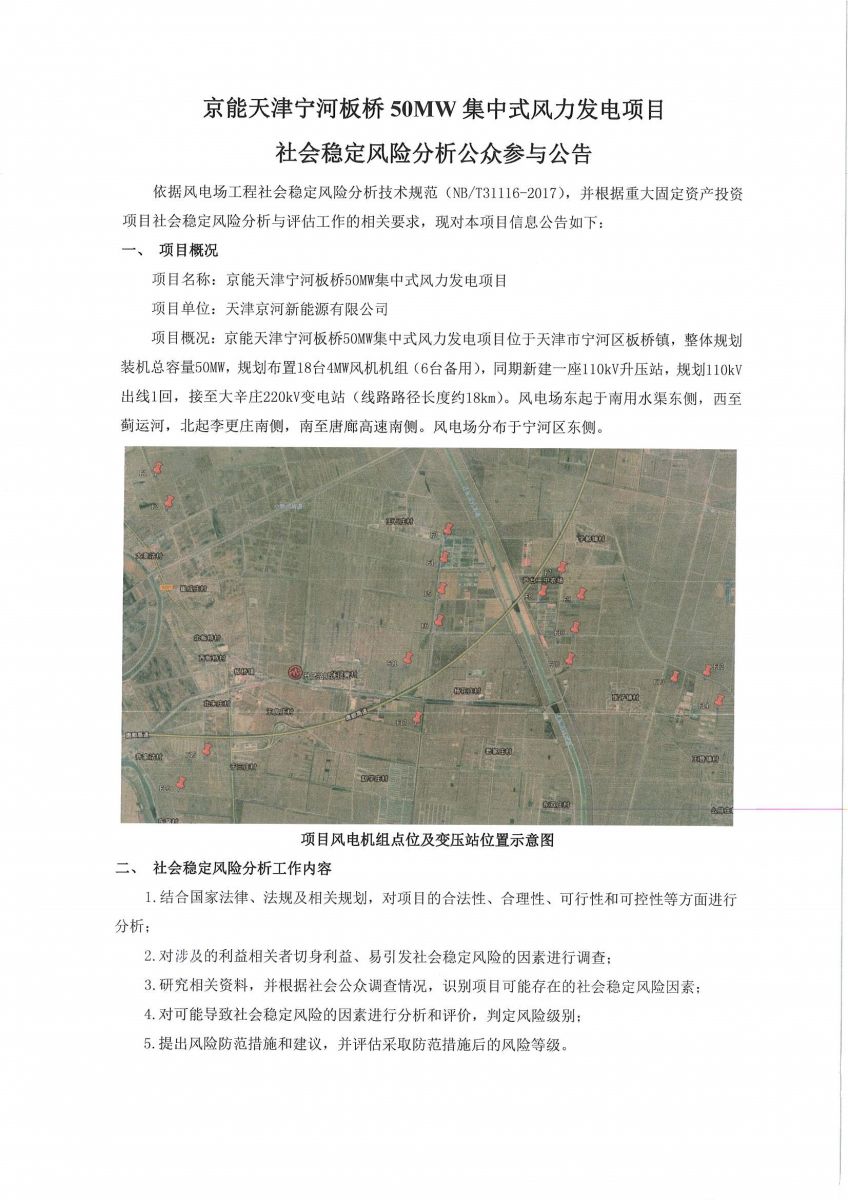 京能天津?qū)幒影鍢?0MW集中式風(fēng)力發(fā)電項(xiàng)目社會穩(wěn)定風(fēng)險(xiǎn)分析公眾參與公告