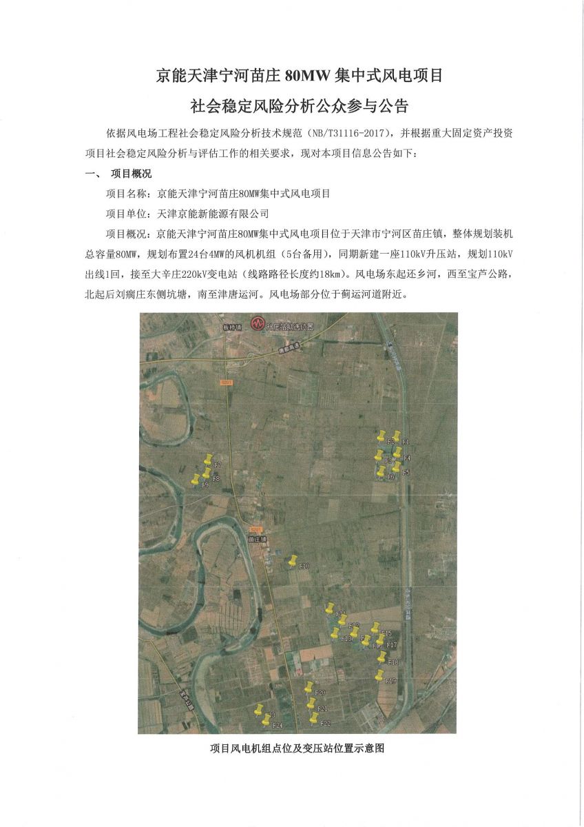 京能天津寧河苗莊80MW集中式風電項目社會穩(wěn)定風險分析公眾參與公告