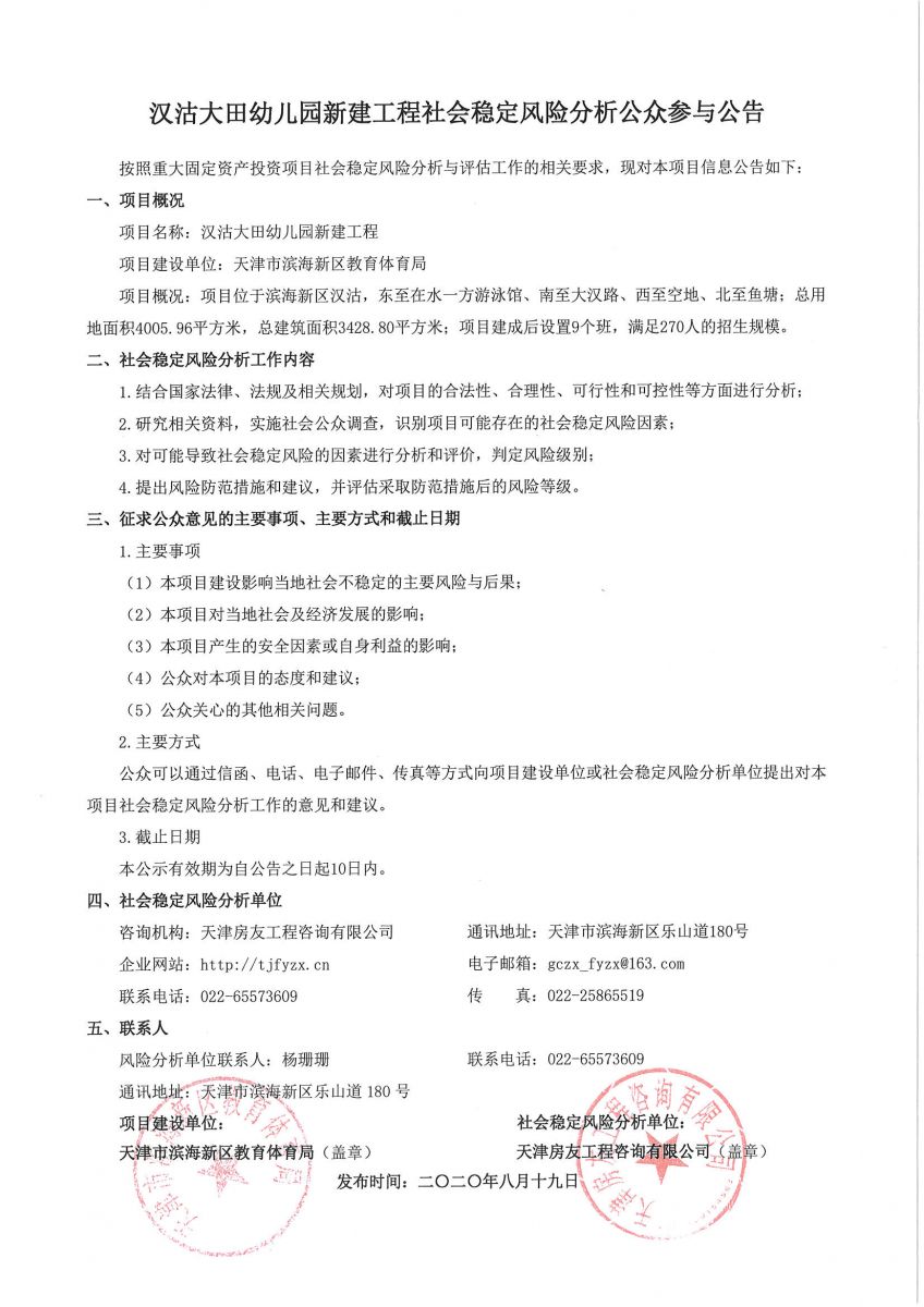 漢沽大田幼兒園新建工程社會(huì)穩(wěn)定風(fēng)險(xiǎn)分析公眾參與公告