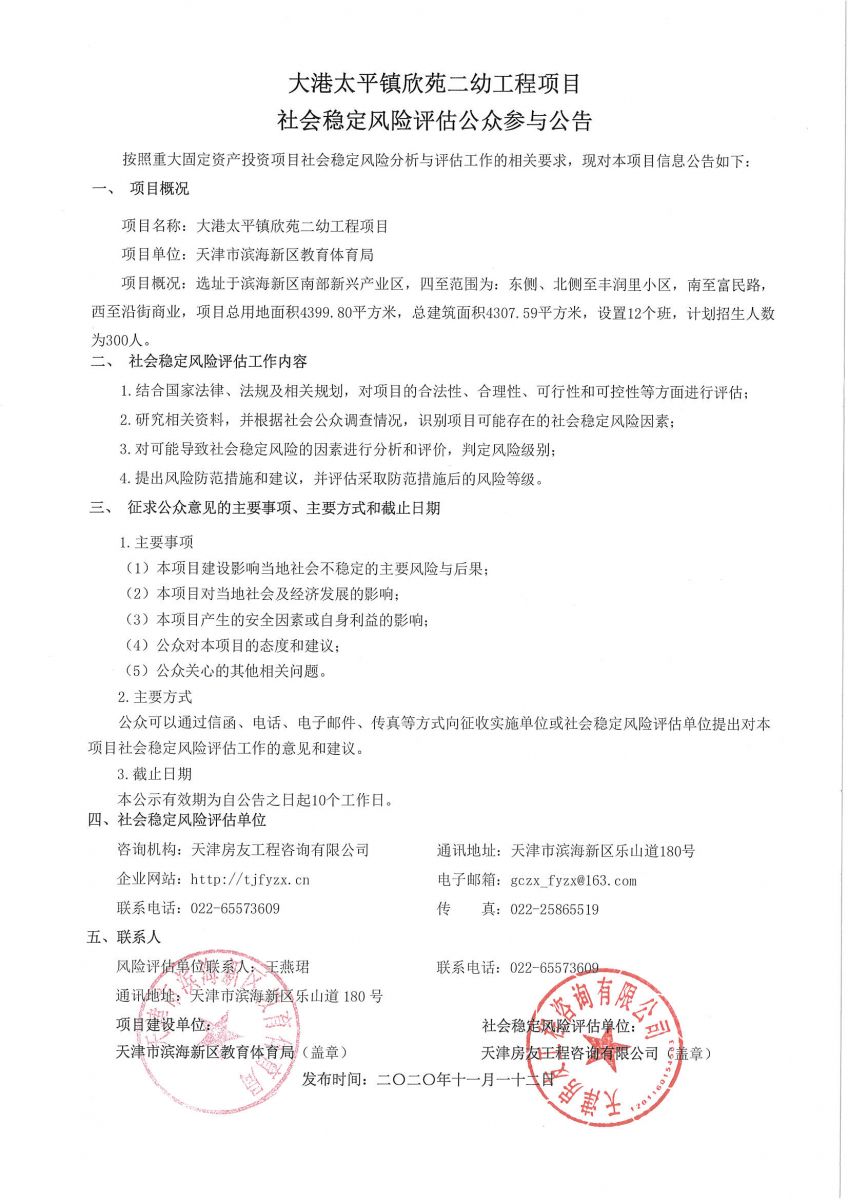 大港太平鎮(zhèn)欣苑二幼工程項(xiàng)目社會(huì)穩(wěn)定風(fēng)險(xiǎn)評(píng)估公眾參與公告