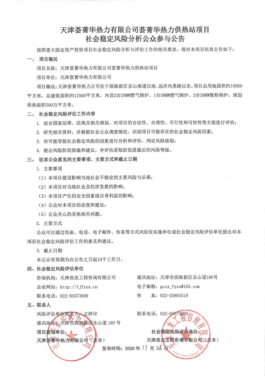 天津薈菁華熱力有限公司薈菁華熱力供熱站項目社會穩(wěn)定風險分析公眾參與公告