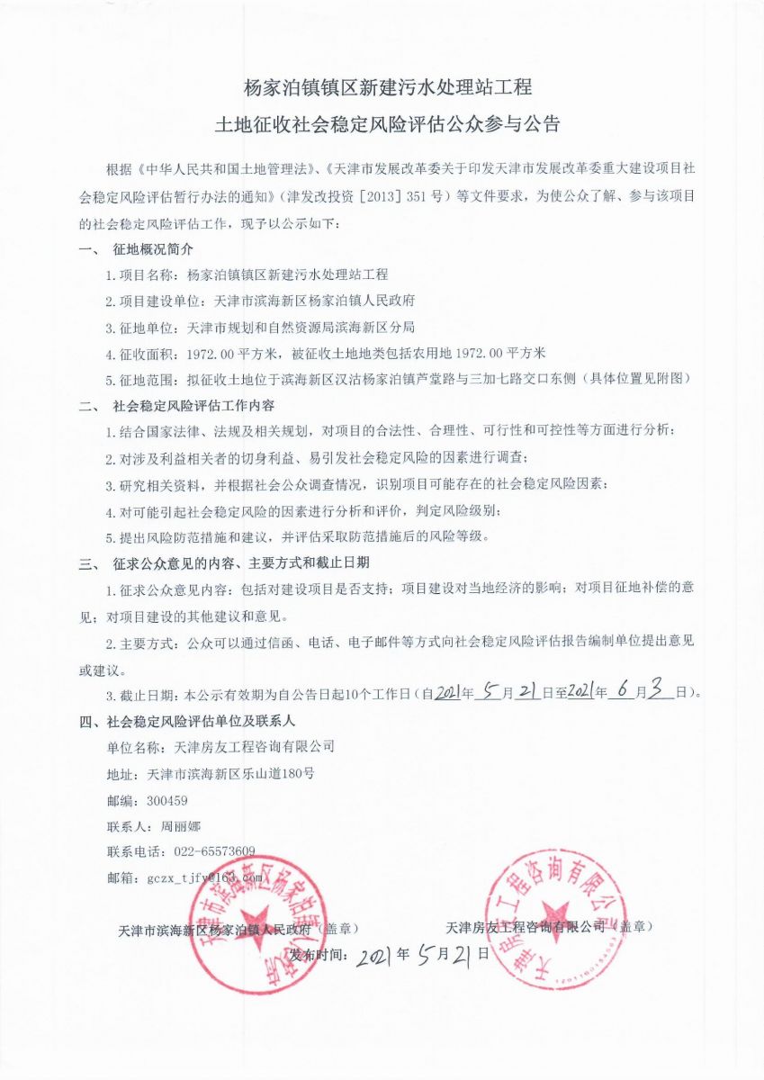 楊家泊鎮(zhèn)鎮(zhèn)區(qū)新建污水處理站工程土地征收社會穩(wěn)定風(fēng)險評估公眾參與公告