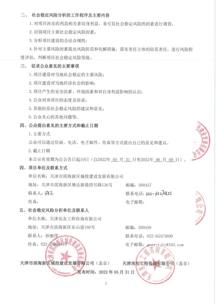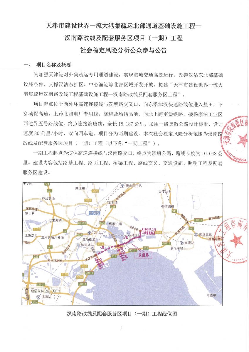 天津市建設(shè)世界一流大港集疏運(yùn)北部通道基礎(chǔ)設(shè)施工程——漢南路改線及配套服務(wù)區(qū)項(xiàng)目(一期)工程社會穩(wěn)定風(fēng)險(xiǎn)分析公眾參與公告