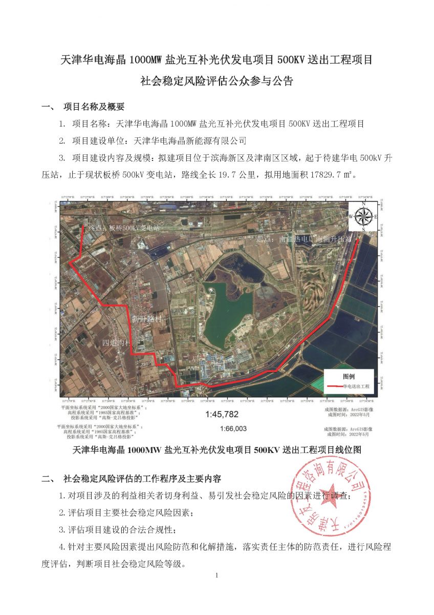 天津華電海晶1000MW鹽光互補光伏發(fā)電項目500KV送出工程項目社會穩(wěn)定風險評估公眾參與公告
