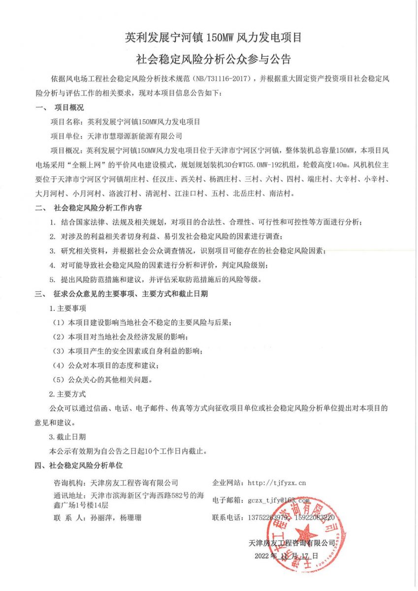 英利發(fā)展寧河鎮(zhèn)150MW風(fēng)力發(fā)電項(xiàng)目社會(huì)穩(wěn)定風(fēng)險(xiǎn)分析公眾參與公告