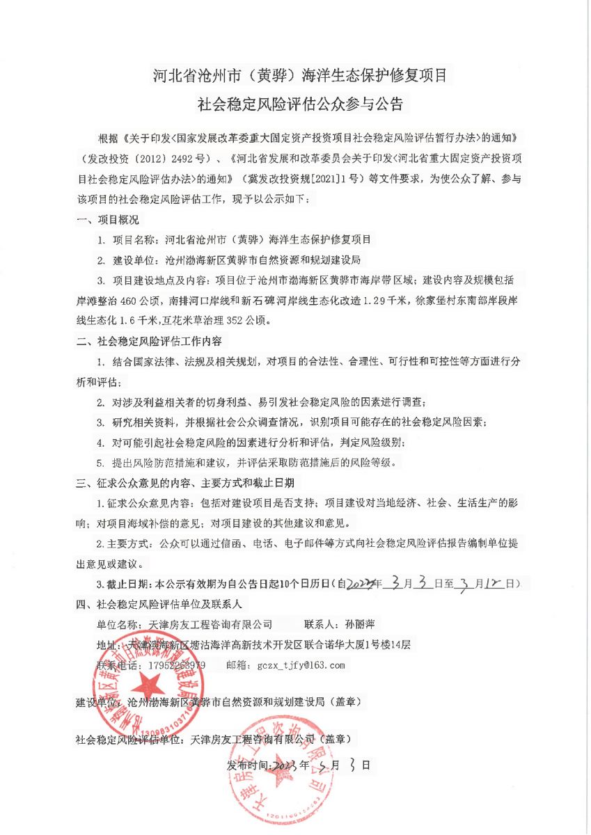 河北省滄州市(黃驊)海洋生態(tài)保護(hù)修復(fù)項(xiàng)目 社會穩(wěn)定風(fēng)險評估公眾參與公告