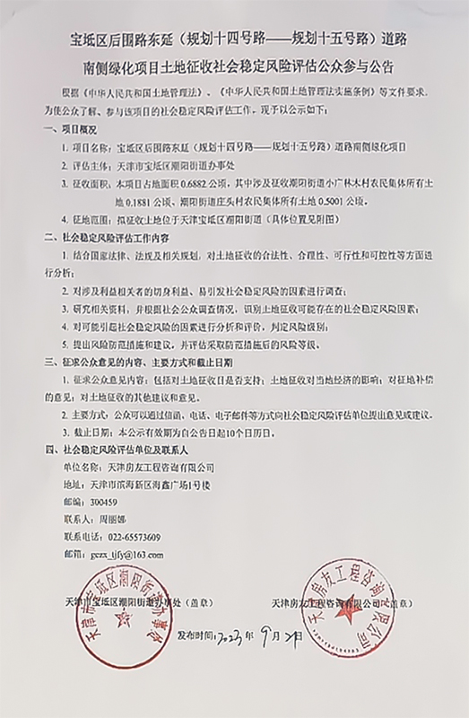 寶坻區(qū)后圍路東延(規(guī)劃十四號(hào)路——規(guī)劃十五號(hào)路)道路南側(cè)綠化項(xiàng)目土地征收社會(huì)穩(wěn)定風(fēng)險(xiǎn)評(píng)估公眾參與公告