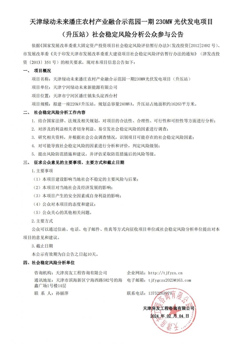 天津綠動未來潘莊農(nóng)村產(chǎn)業(yè)融合示范園一期230MW光伏發(fā)電項目(升壓站)社會穩(wěn)定性風(fēng)險分析公眾參與公告