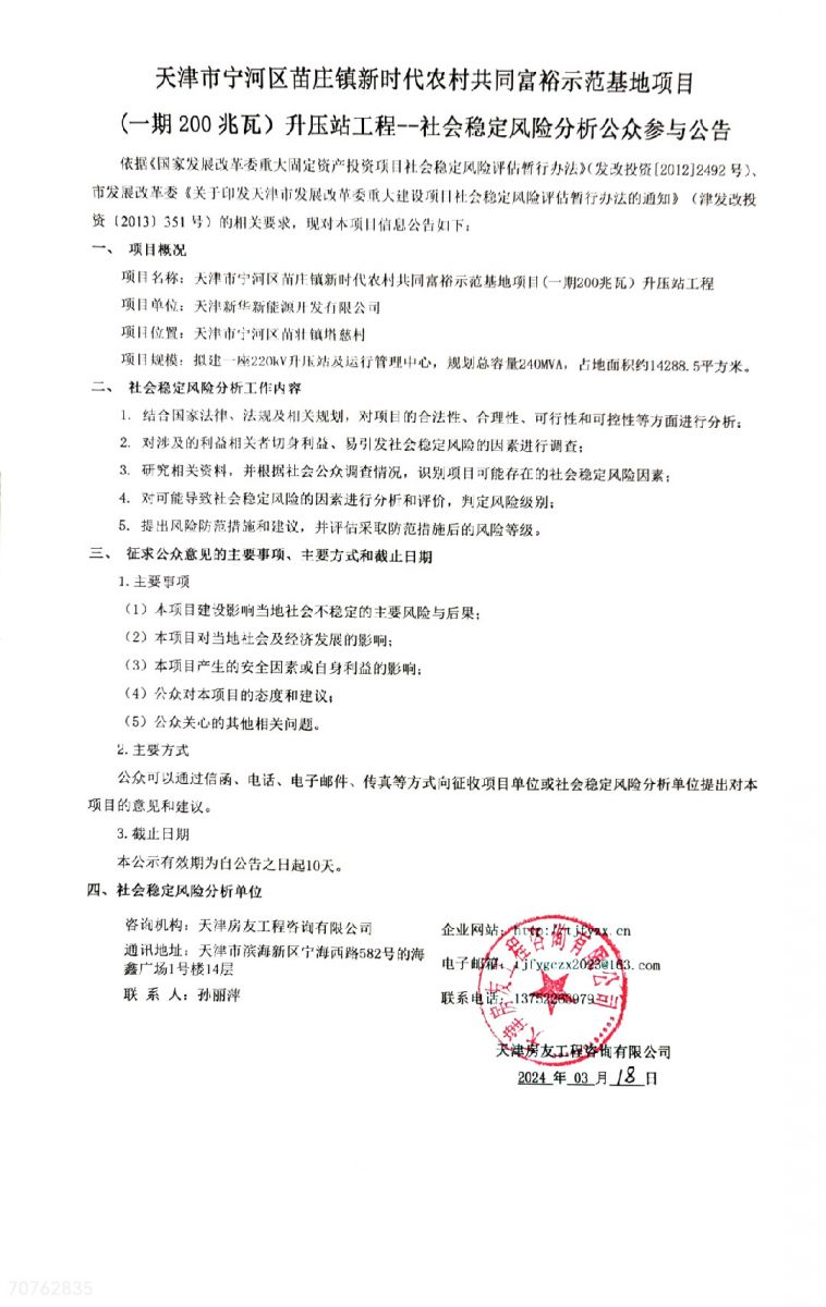 天津市寧河區(qū)苗莊鎮(zhèn)新時代農(nóng)村共同富裕示范基地項(xiàng)目(一期200兆瓦)升壓站工程--社會穩(wěn)定風(fēng)險分析公眾參與公告