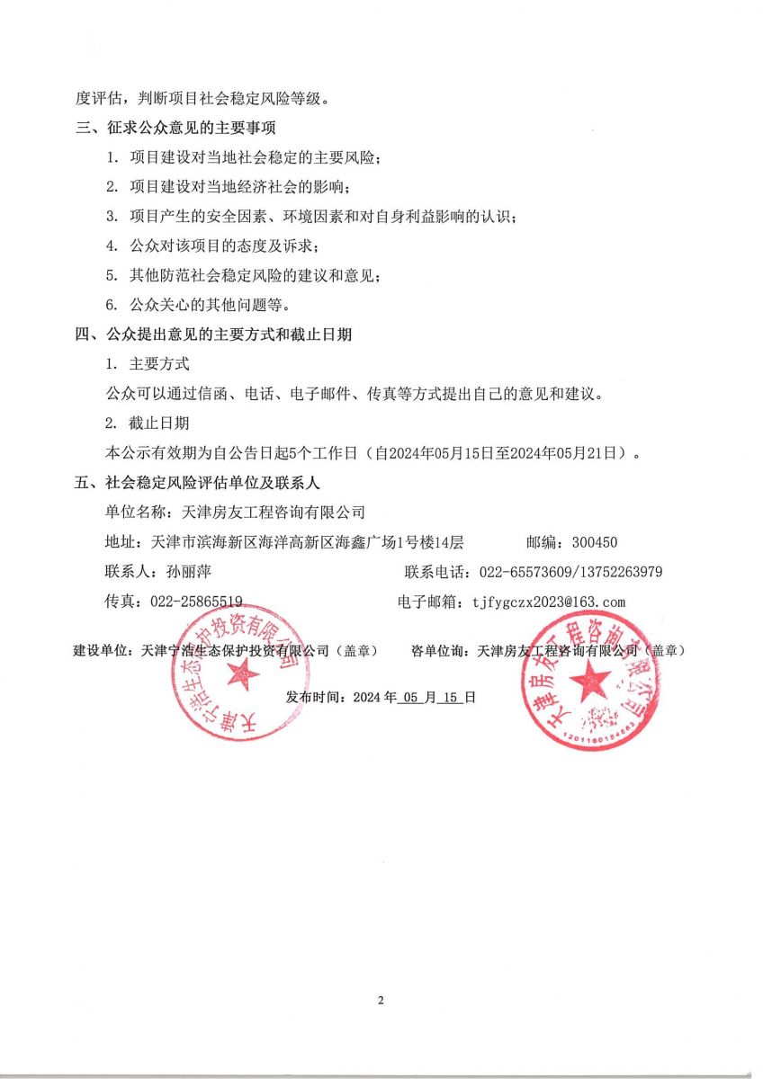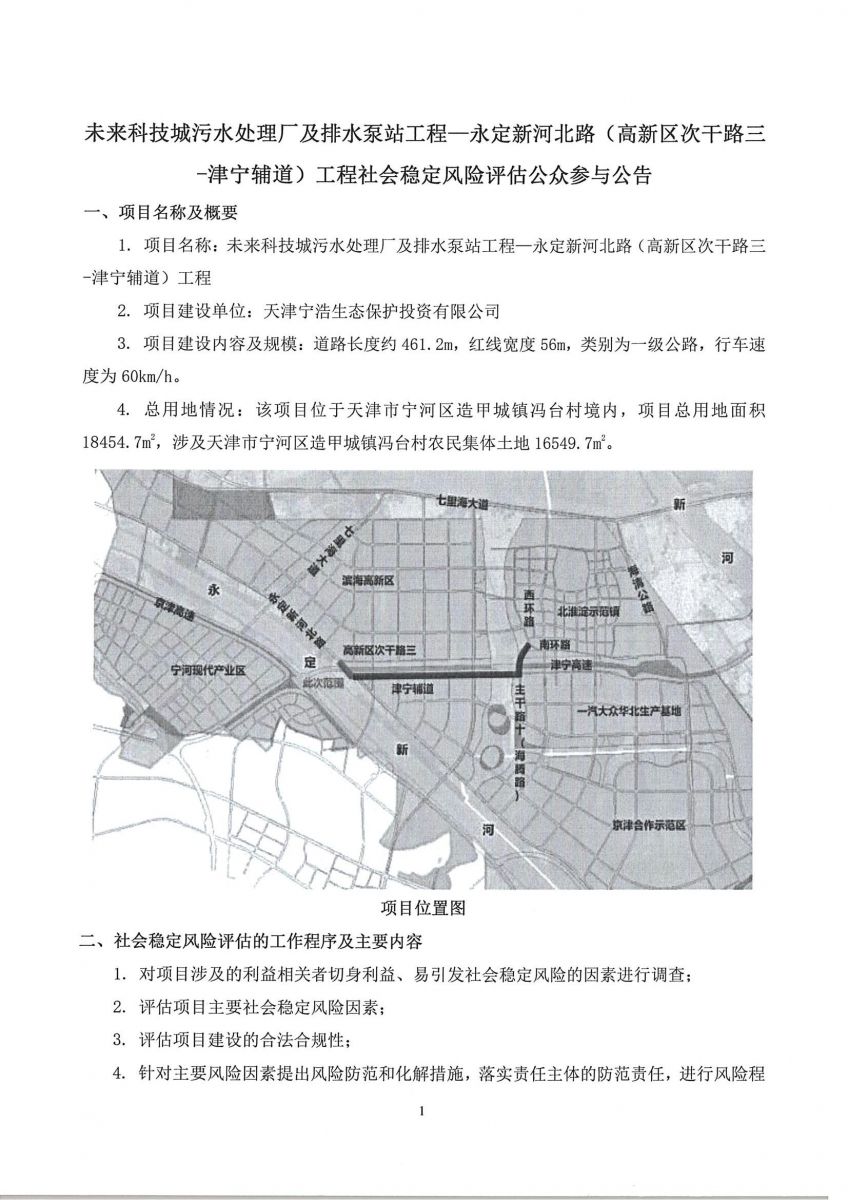 未來科技城污水處理廠及排水泵站工程—永定新河北路(高新區(qū)次干路三—津?qū)庉o道)工程社會(huì)穩(wěn)定風(fēng)險(xiǎn)評(píng)估公眾參與公告